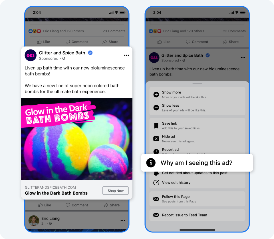 Você pode clicar no menu de três pontos, no canto superior direito de qualquer anúncio que você vê em seu Feed do Facebook, e navegar para a ferramenta “Por que estou vendo este anúncio?”. Se uma explicação na ferramenta não for clara ou estiver confusa, queremos ouvir sobre isso.
