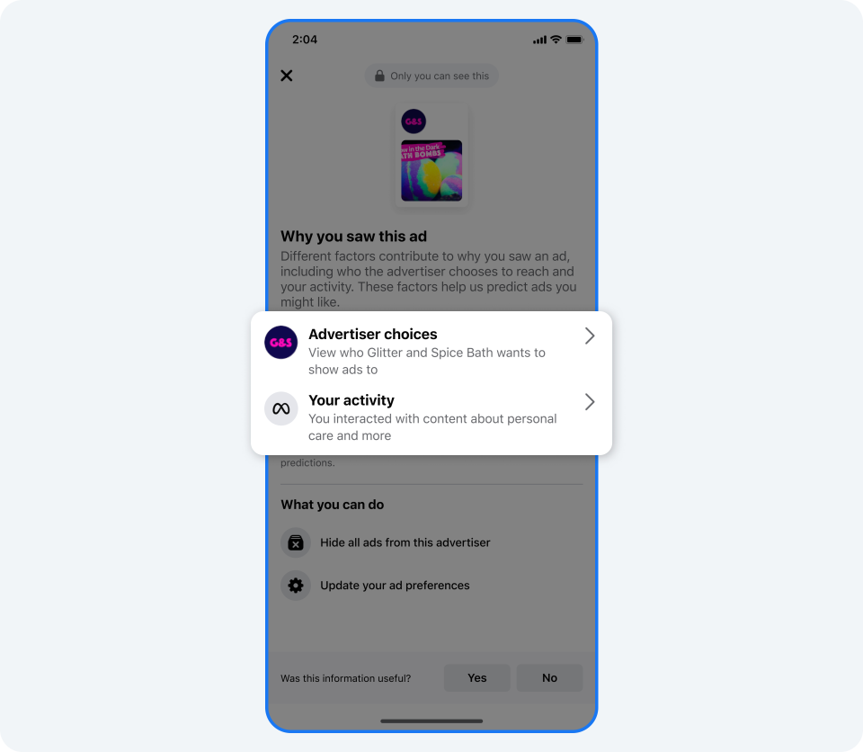 Você pode usar a ferramenta de feedback no fim de “Por que estou vendo este anúncio?” para nos contar sobre sua experiência e como podemos melhorar. Como sempre, você ainda pode esconder todos os anúncios de um determinado anunciante e acessar suas preferências de anúncios na interface “Por que estou vendo este anúncio?”.